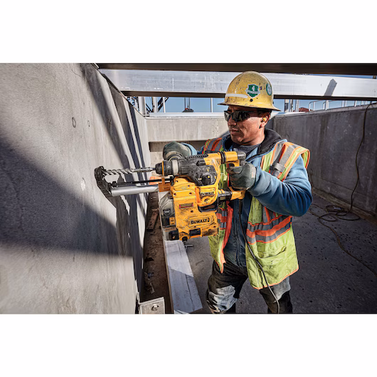 Our 1-1/8 in. SDS Plus Rotary Hammer Kit delivers high performance with low vibration and a lightweight design for working all day. It’s built to meet the demands of professional contractors. The durable German-engineered hammering mechanism delivers 3.5 joules of impact energy, giving you the speed to get through jobs fast. SHOCKS Active Vibration Control® reduces vibration felt at the handles for less user fatigue. With hard-hitting power, fast drilling speed, and a balanced design, this hammer is ideally suited for large diameter hole drilling in the hardest concrete. Make this tool an OSHA Table 1 Compliant solution when paired with our DWH304DH Onboard Dust Extractor.