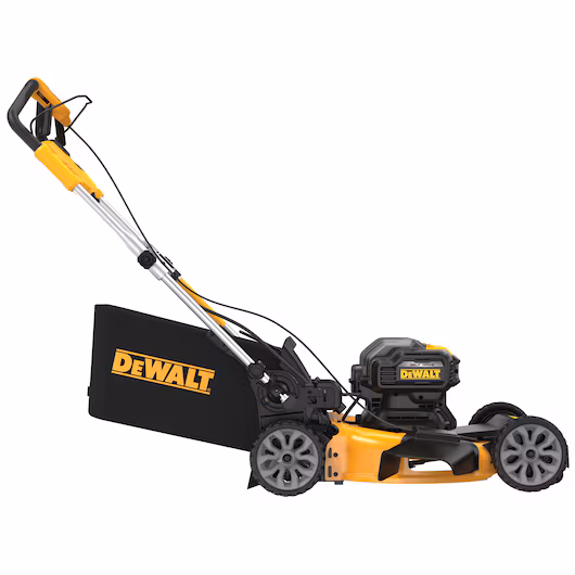 Featuring a brushless, direct drive motor that delivers up to 60 minutes of runtime in one charge**, this self-propelled lawn mower has the power you need to get the job done. Innovative, auto-sensing technology achieves higher rpm so you can cut thicker grass whether you are mulching, bagging, or using the side discharge. With a fold-over handle for convenient transport and integrated vertical storage, this cordless mower takes up 70% less space in your garage than it does when in operation. Count on the DEWALT FWD Self-Propelled Lawn Mower to deliver the power needed to tackle your lawn in comfort.