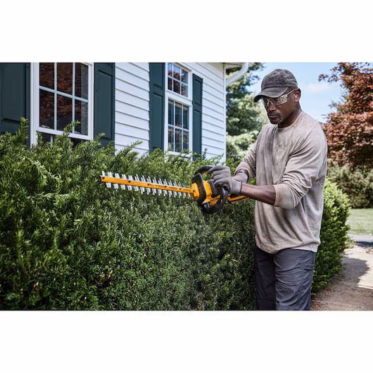Get a professional-looking yard with the 60V MAX* 26 in. Brushless Cordless Hedge Trimmer. Great for trimming hedges, bushes, and small branches, this Hedge Trimmer features a brushless motor that delivers up to 3,400 strokes per minute for quick trimming. The durable 26 in. hardened steel, laser-cut blade offers long-term durability with a blade gap of 1-1/4 in. and dual shear edges for efficient cutting. Designed for less hand strain, a wrap-around auxiliary handle provides the user with a comfortable grip during use. Battery sold separately.