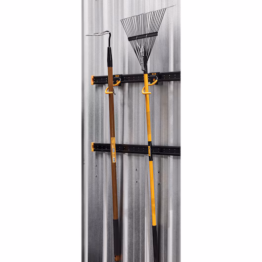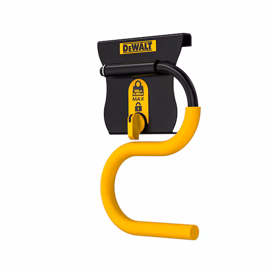 The DEWALT Long Handled Tool Hook is part of the DEWALT Workshop Storage System and mounts directly to DEWALT Metal Rail. It is perfect for storing long handled tools such as rakes, brooms, shovels and garden hoes. It is constructed of heavy-duty steel that can support up to 25 lbs. and is coated with a non-slip material that helps prevent scratches and corrosion. It also features a patented latching system that secures the hook to the rail.